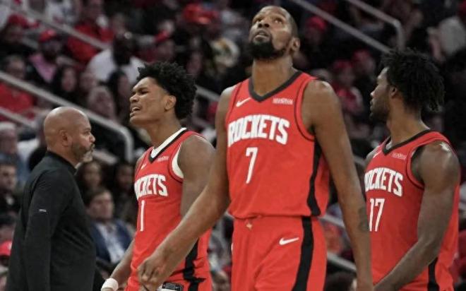 杜蘭特的個(gè)人表現(xiàn)無可挑剔,開局兩戰(zhàn)場(chǎng)均貢獻(xiàn)30分、6籃板、2助攻和1.5搶斷,數(shù)據(jù)亮眼,盡力程度毋庸置疑。然而,球隊(duì)的致命死穴在于控衛(wèi)位置的真空。誰能想到,杜蘭特從太陽轉(zhuǎn)戰(zhàn)休斯頓,竟再次遭遇“無控衛(wèi)魔咒”?這仿佛是命運(yùn)的玩笑,讓他無論身處何隊(duì),都難以擺脫組織核心的缺失。更令人擔(dān)憂的是,火箭的“死亡五大”陣容過于笨重,機(jī)動(dòng)性不足,容易被對(duì)手外線火力撕裂。防守端漏洞頻出,進(jìn)攻端缺乏流暢性,杜蘭特雖如孤狼般奮戰(zhàn),卻難敵體系崩壞。