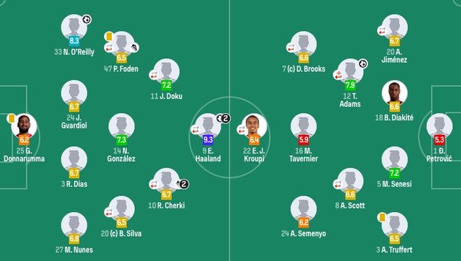 第33分鐘,謝爾基再送助攻,哈蘭德單刀雙響,曼城2-1伯恩茅斯。